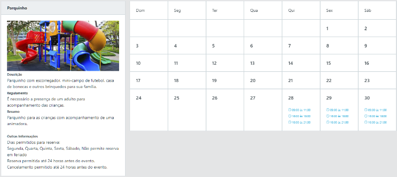 Calendário completo com datas e horários disponíveis e fácil gerenciamento das reservas.